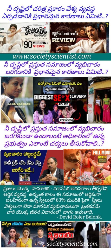 ప్రజలు యొక్క సామాజిక – మానసిక అవసరాలు తీర్చలేని ఆర్థిక వ్యవస్థ ఉన్నంత కాలం ఈ సమాజంలో ఆర్థికంగా బలహీనంగా ఉన్న స్త్రీలులో 63% మందికి పైగా స్త్రీలు వేశ్యలుగా లేదా మానసిక వ్యభిచారులుగా బ్రతకడమే వారి యొక్క జీవన విధానంలో భాగం అవుతాది. > Devid Roler Belonk.